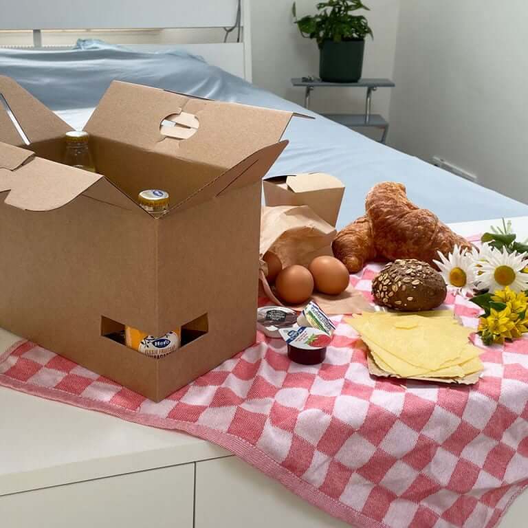 Met de take away box kun je je klanten ook voorzien van een royaal ontbijt. Wat dacht je van sinaasappelsap, yoghurt met muesli, een gekookt eitje en verschillende broodjes met beleg, zoals een croissantje met jam en een hard broodje met kaas? Daarmee maak je als hotel of bakkerij de vroege vogels blij.